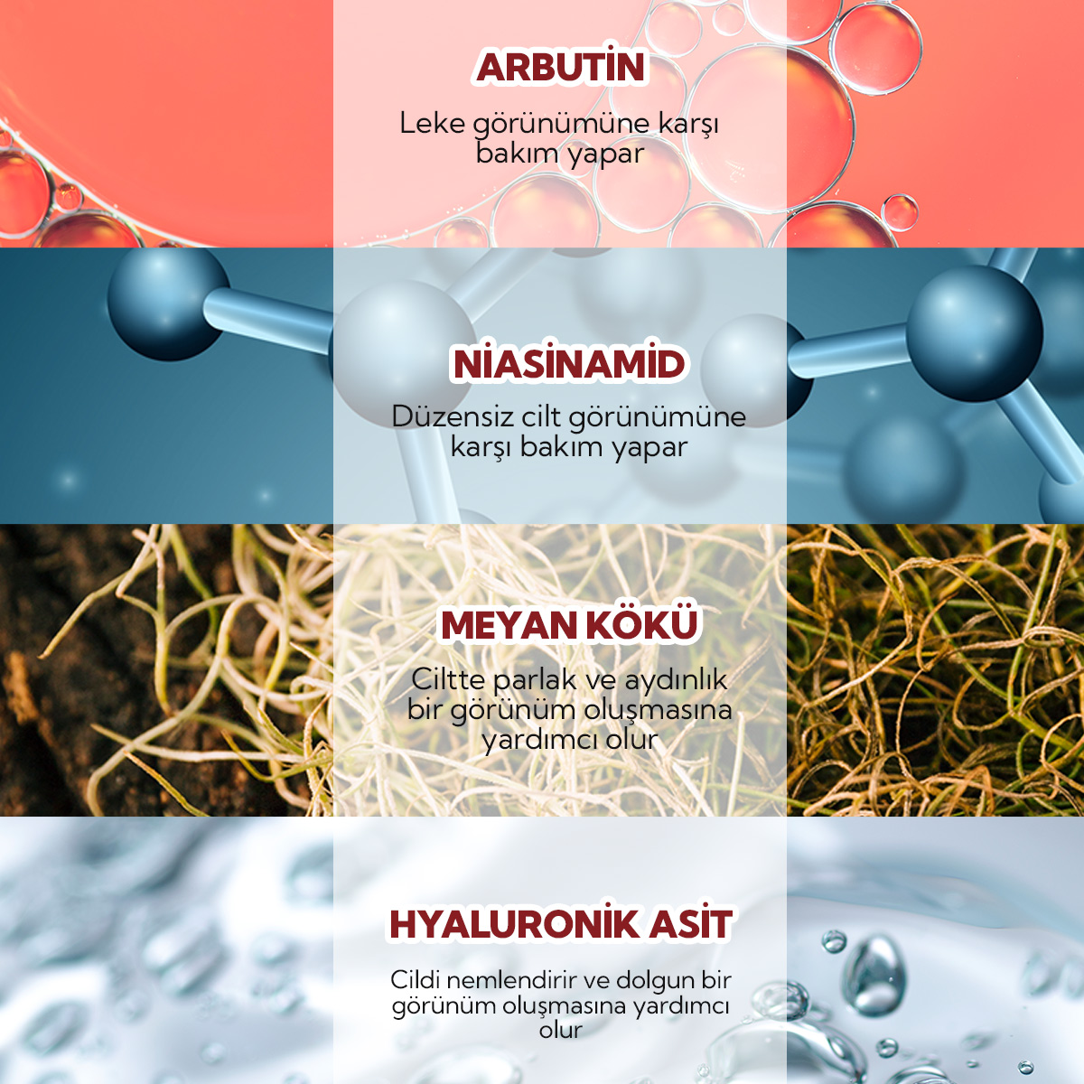 | Faydası | Cildi yağdan, makyajdan ve kirden arındırmaya yardımcıdır. | Cilde aydınlık bir görünüm verir. | Göz çevresindeki koyu görünümün azalmasına yardımcı olur | Cildin gün boyu nemlenme ihtiyacını karşılar |