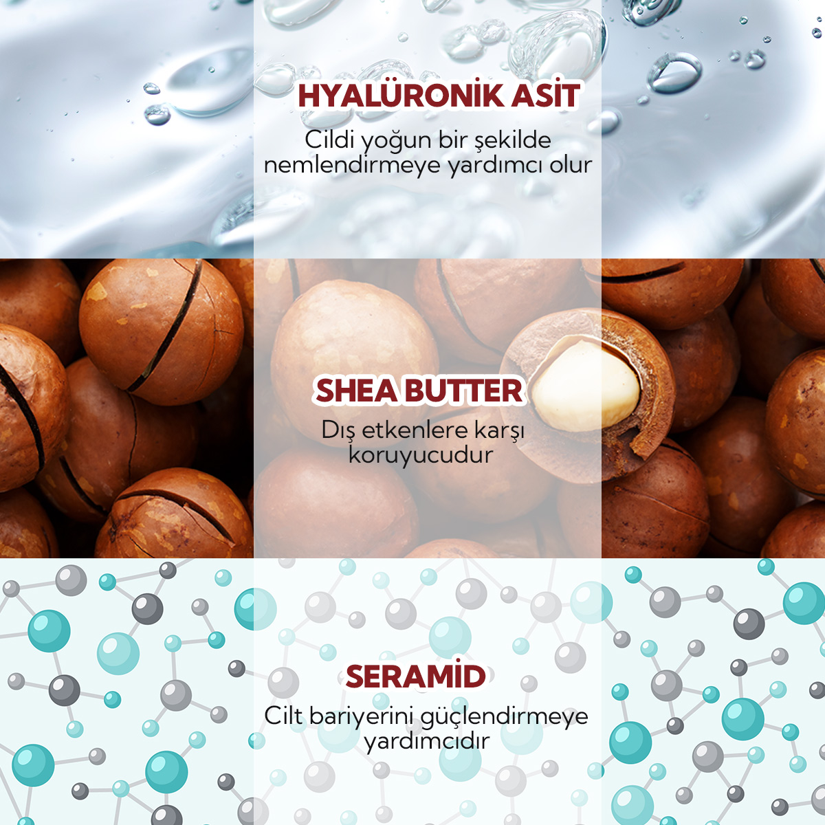 İçeriğinde bulunan Seramid, Shea Butter, Squalane ve Hyaluronik Asit, cildin doğal bariyerini güçlendirerek nem kaybını önlemeye ve çevresel faktörlere karşı koruma sağlamaya yardımcı olur.