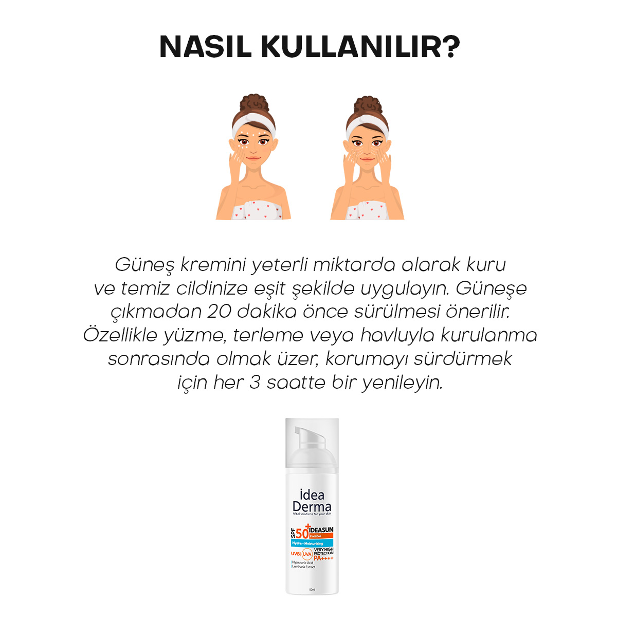 • Güneş kremini yeterli miktarda alarak kuru ve temiz cildinize eşit şekilde uygulayınız.